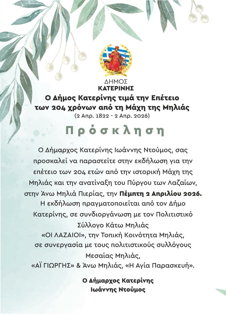 Την Πέμπτη 02 Απριλίου 2026 εκδήλωση, για την επέτειο των 204 ετών από την ιστορική Μάχη της Μηλιάς και την ανατίναξη του Πύργου των Λαζαίων, θα πραγματοποιηθεί από τον Δήμο Κατερίνης, σε συνδιοργάνωση με τον Πολιτιστικό Σύλλογο Κάτω Μηλιάς «ΟΙ ΛΑΖΑΙΟΙ», την Τοπική Κοινότητα Μηλιάς, σε συνεργασία με τους πολιτιστικούς συλλόγους Μεσαίας Μηλιάς, «ΑΪ ΓΙΩΡΓΗΣ» & Άνω Μηλιάς, «Η Αγία Παρασκευή».