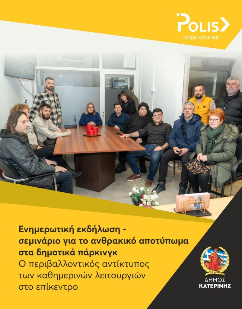 Το ανθρακικό αποτύπωμα και η σημασία του στην αντιμετώπιση της κλιματικής αλλαγής, τέθηκε στο επίκεντρο της ενημερωτικής εκδήλωσης – σεμιναρίου για τους εργαζομένους στα δημοτικά πάρκινγκ, η οποία πραγματοποιήθηκε σήμερα στις εγκαταστάσεις της POLIS A.E.
