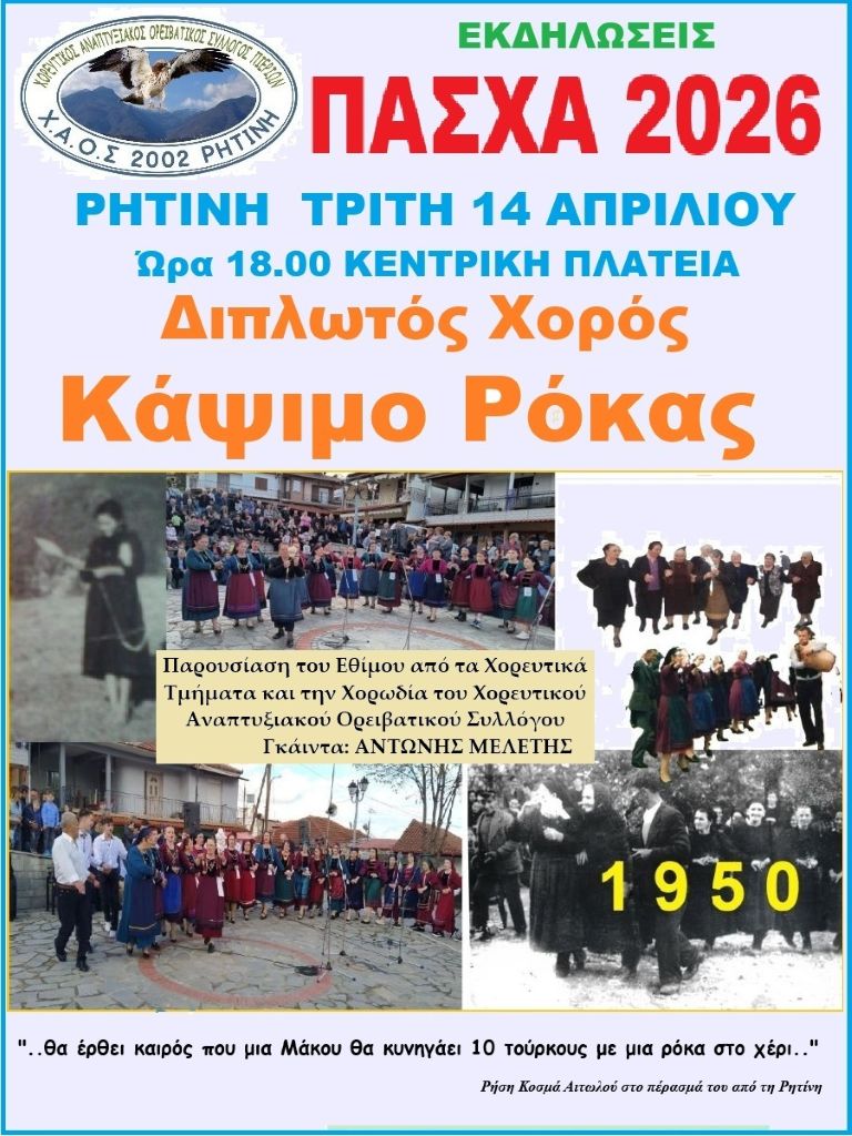 ΤΡΙΤΗ 14 Απριλίου 2026, ώρα 18.00, κεντρική πλατεία Ρητίνης