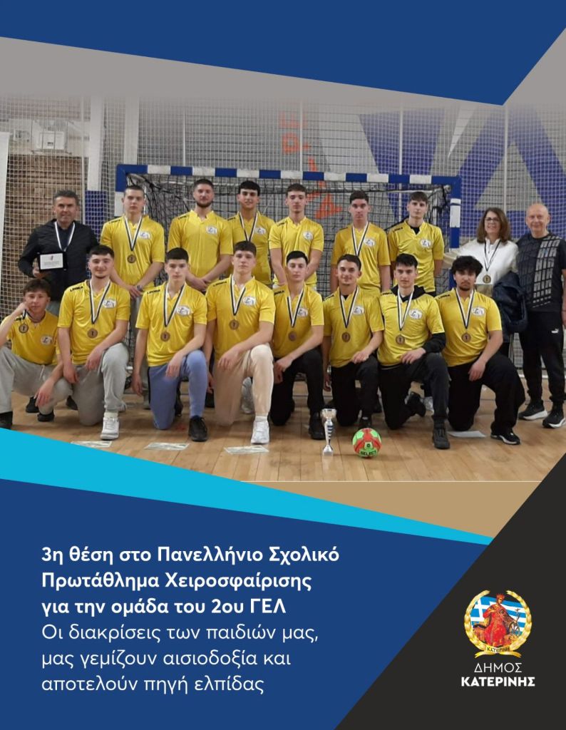 Εκφράζω τα θερμά μου συγχαρητήρια στην ομάδα χάντμπολ του 2ου ΓΕΛ Κατερίνης για την κατάκτηση της 3ης θέσης στο Πανελλήνιο Σχολικό Πρωτάθλημα Χειροσφαίρισης.