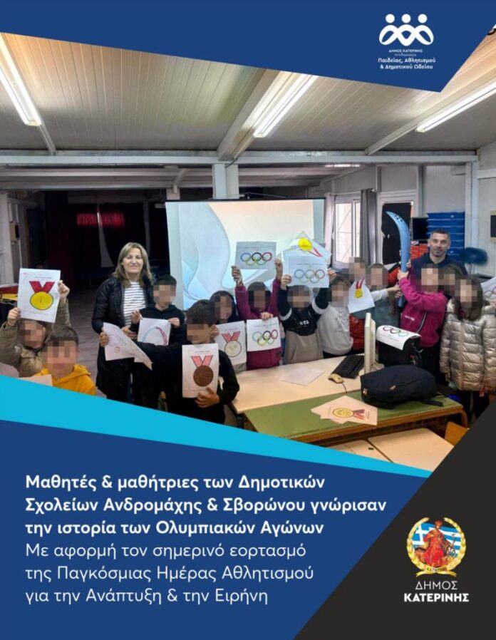 Την ευκαιρία να γνωρίσουν την ιστορία των Ολυμπιακών Αγώνων, από τη γέννησή τους στην αρχαιότητα έως και τη σύγχρονη εποχή, μέσα από παρουσίαση – προβολή οπτικοακουστικού υλικού με θεματολογία τον αθλητισμό και τις αξίες του Ολυμπισμού είχαν οι μαθητές και οι μαθήτριες της Γ’ και Δ’ τάξης των Δημοτικών Σχολείων Ανδρομάχης και Σβορώνου. Αφορμή στάθηκε η Παγκόσμια Ημέρα Αθλητισμού για την Ανάπτυξη και την Ειρήνη, η οποία έχει καθιερωθεί από τα Ηνωμένα Έθνη να εορτάζεται στις 6 Απριλίου κάθε έτους,