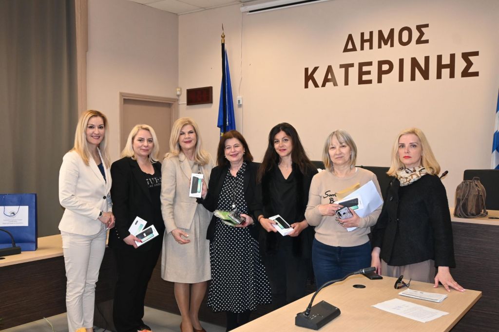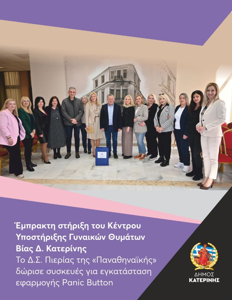 Με σκοπό την έμπρακτη στήριξη της ασφάλειας ωφελούμενων του Κέντρου Υποστήριξης Γυναικών Θυμάτων Βίας Δ. Κατερίνης, δωρεά συσκευών κινητής τηλεφωνίας για εγκατάσταση εφαρμογής panic button, αξίας 1.300 ευρώ, παρέδωσαν στον Δήμο Κατερίνης τα μέλη του Δ.Σ. του Παραρτήματος Πιερίας της Πανελλαδικής Οργάνωσης Γυναικών «Παναθηναϊκή», με επικεφαλής την Πρόεδρο, Φωτεινή Φλογέρα.
