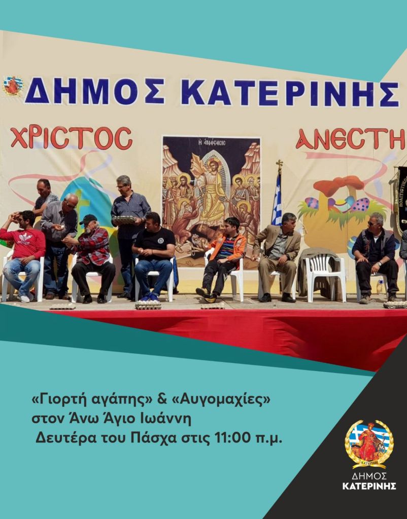 Η καθιερωμένη «ΓΙΟΡΤΗ ΑΓΑΠΗΣ» θα πραγματοποιηθεί στην Κοινότητα Άνω Αγίου Ιωάννη, τη δεύτερη ημέρα (Δευτέρα 13 Απριλίου) του Πάσχα. Την Πασχαλινή γιορτή, που θα γίνει στην πλατεία του χωριού & ώρα 11:00 π.μ. συνδιοργανώνουν ο τοπικός πολιτιστικός σύλλογος «ΑΡΓΟΣ» και ο Δήμος Κατερίνης/Αντιδημαρχία Πολιτισμού – Τουρισμού.