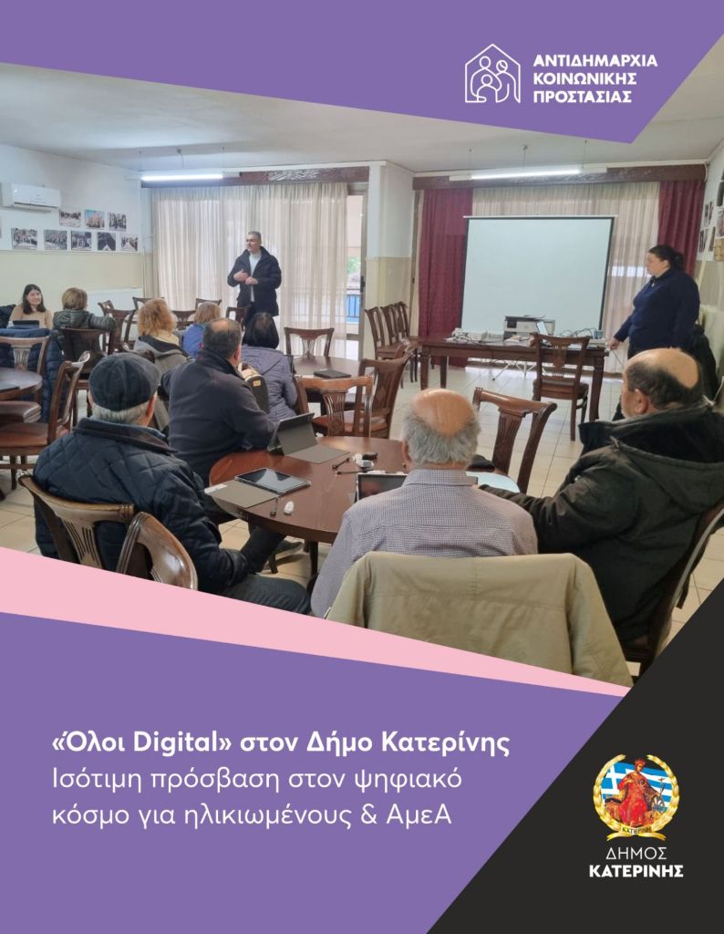 Ο λόγος για το πρόγραμμα «Όλοι Digital», που με μεγάλη ανταπόκριση υλοποιείται από την αντιδημαρχία Κοινωνικής Προστασίας ενώ θέτει ως στόχο την ενίσχυση των ψηφιακών δεξιοτήτων των εκπαιδευομένων. Επιπλέον, συμβάλλει ουσιαστικά στην αυτονομία, την καθημερινή εξυπηρέτηση και την κοινωνική τους ένταξη.