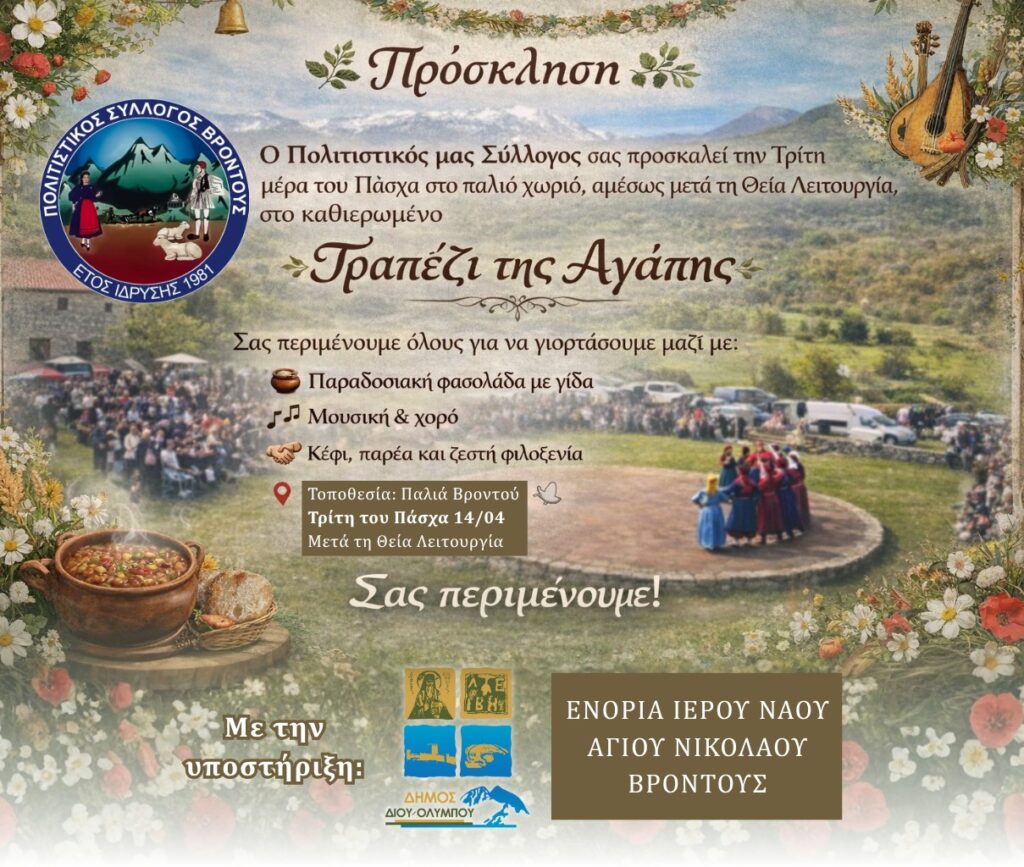 Πρόσκληση στην πασχαλινή εκδήλωση “Τραπέζι της Αγάπης” του Πολιτιστικού Συλλόγου Βροντούς, που θα διοργανωθεί την Τρίτη του Πάσχα (14 Απριλίου 2026) στην Παλιά Βροντού, μετά τη Θεία Λειτουργία, με την υποστήριξη του Δήμου Δίου-Ολύμπου και της Ενορίας του Ιερού Ναού Αγίου Νικολάου Βροντούς.