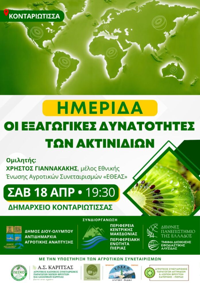 Ο Δήμος Δίου-Ολύμπου σας προσκαλεί στην ενημερωτική ημερίδα Οι εξαγωγικές δυνατότητες των ακτινιδίων» το Σάββατο 18 Απριλίου 2026 (ώρα 19:30) στο Δημαρχείο Κονταριώτισσας.