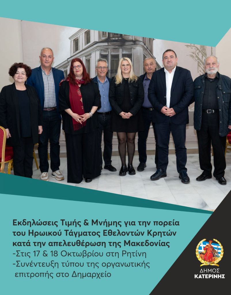 Για τις εκδηλώσεις ανάδειξης της πορείας του Ηρωικού Τάγματος των Κρητών Εθελοντών στην ορεινή Πιερία και στην Μακεδονία την περίοδο 1912 – 1913, με επίκεντρο τη Ρητίνη (στις 16 Οκτωβρίου 1912), συνέντευξη παραχώρησαν σήμερα στο Δημαρχείο Κατερίνης προς τους εκπροσώπους των τοπικών μέσων ενημέρωσης, τα μέλη της οργανωτικής επιτροπής.