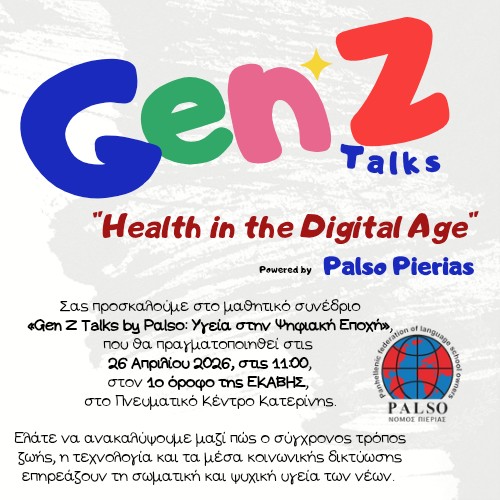Σας προσκαλούμε στο Μαθητικό Συνέδριο “GenZ Talks by Palso: Υγεία στην Ψηφιακή Εποχή“, που θα πραγματοποιηθεί την Κυριακή, 26 Απριλίου 2026, στις 11:00,