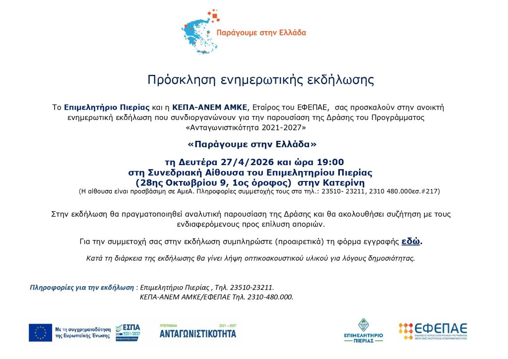 Το Επιμελητήριο Πιερίας και η ΚΕΠΑ-ΑΝΕΜ ΑΜΚΕ, Εταίρος του ΕΦΕΠΑΕ, σας προσκαλούν στην ανοικτή ενημερωτική εκδήλωση που συνδιοργανώνουν για την παρουσίαση της Δράσης «Παράγουμε στην Ελλάδα», του Προγράμματος «Ανταγωνιστικότητα 2021-2027», τη Δευτέρα 27/4/2026 και ώρα 19:00 στη Συνεδριακή Αίθουσα (1ος όροφος) του Επιμελητηρίου Πιερίας.