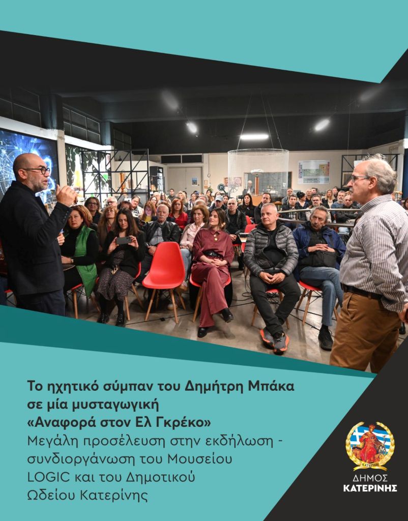 Με μεγάλη προσέλευση ολοκληρώθηκε το Σάββατο 25 Απριλίου, η ηχητική και εικαστική του έργου «Αναφορά στον Ελ Γκρέκο» στο Μουσείο LOGIC. Η εκδήλωση, που συνδιοργανώθηκε με το Δημοτικό Ωδείο Κατερίνης, έδωσε την δυνατότητα σε όσους δεν κατάφεραν να παραστούν στην πρεμιέρα, να ζήσουν μια πρωτότυπη ηλεκτροακουστική εμπειρία με την υπογραφή του συνθέτη και καλλιτέχνη ήχου, Δημήτρη Μπάκα.
