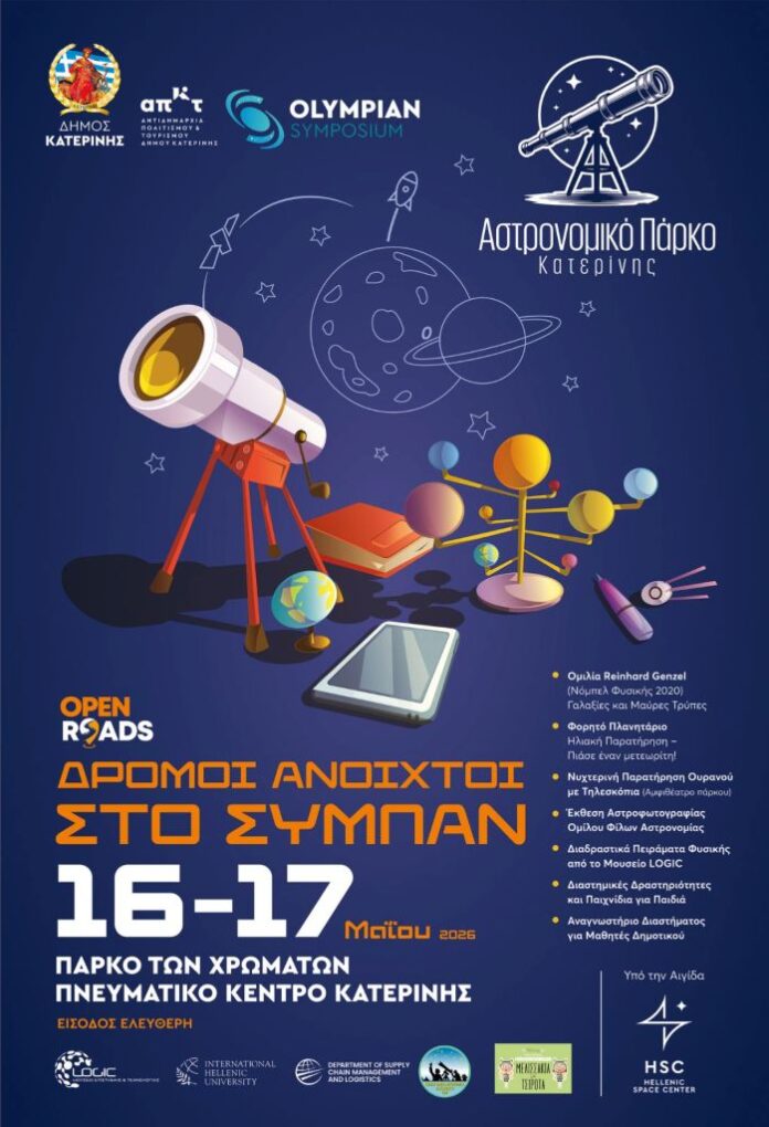 Τις εκδηλώσεις διοργανώνει ο Δήμος Κατερίνης/Αντιδημαρχία Πολιτισμού & Τουρισμού, στο πλαίσιο του Open roads/Δρόμοι Ανοιχτοί και του 5ου Παγκοσμίου Συνεδρίου Αστροφυσικής “The Olympian Symposium 2026”, υπό την αιγίδα του Ελληνικού Κέντρου Διαστήματος (ΕΛΚΕΔ), με την συνεργασία του Μουσείου Επιστήμης & Τεχνολογίας LOGIC, του Τμήματος Διοίκησης Εφοδιαστικής Αλυσίδας του Διεθνούς Πανεπιστημίου της Ελλάδος, του Ομίλου Φίλων Αστρονομίας Θεσσαλονίκης, της Παιδικής Λέσχης Βιβλίου «Μελισσάκια με τσιρότα».