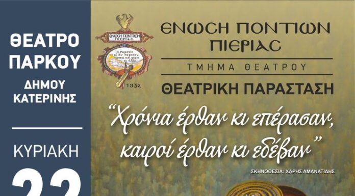Η Ένωση Ποντίων Πιερίας έχει την τιμή και την χαρά να σας προσκαλέσει την Κυριακή 22 Σεπτεμβρίου 2024 και ώρα 20:00 στο Δημοτικό Θέατρο...
