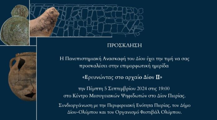 Στις 5 Σεπτεμβρίου 2024 διεξήχθη στο Κέντρο Μεσογειακών ψηφιδωτών στο Δίον η ημερίδα «Ερευνώντας στο αρχαίο Δίον ΙΙ». Πρόκειται για την 2η ημερίδα που...