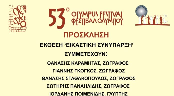 Πάντα οι δημιουργίες των εικαστικών αποτελούσαν και αποτελούν θεσμική αναφορά του Οργανισμού Φεστιβάλ Ολύμπου. Έτσι και φέτος στο θεματολόγιο του 53ου Φεστιβάλ Ολύμπου φιλοξενείται...