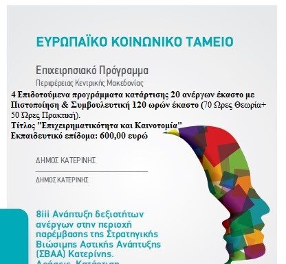 ΠΡΑΞΗ: «Ανάπτυξη δεξιοτήτων ανέργων στην περιοχή παρέμβασης της Στρατηγικής Βιώσιμης Αστικής Ανάπτυξης (ΣΒΑΑ) Κατερίνης» Κωδικός ΟΠΣ 5066578. Υποέργο  1. Προγράμματα επιμόρφωσης ανέργων για την προώθηση...