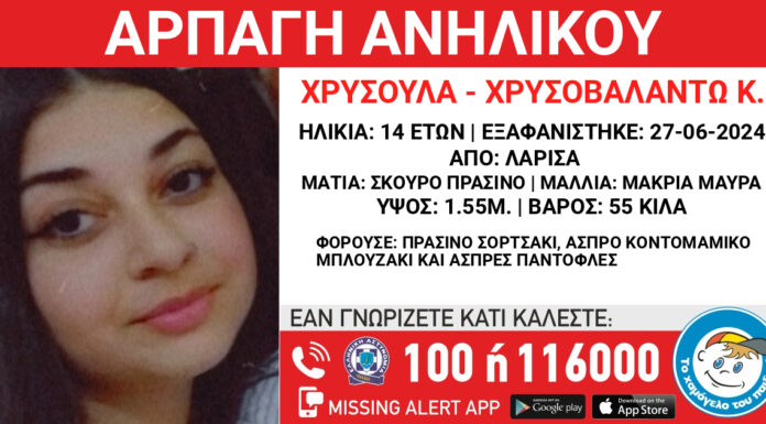 Συναγερμός έχει σημάνει στις Αρχές για την αρπαγή ενός 14χρονου κοριτσιού από τη Λάρισα. Σύμφωνα με το «Χαμόγελο του Παιδιού», στην εξαφάνιση της 14χρονης εμπλέκεται...