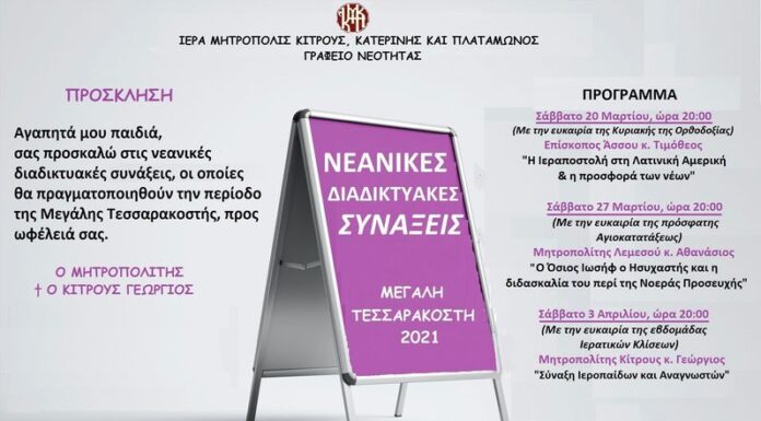 Με την ευκαιρία της Μεγάλης Τεσσαρακοστής, το Γραφείο Νεότητας της Ιεράς Μητροπόλεως Κίτρους, Κατερίνης και Πλαταμώνος συνεχίζει οργανωμένα και συντεταγμένα τις διαδικτυακές Συνάξεις πνευματικού...
