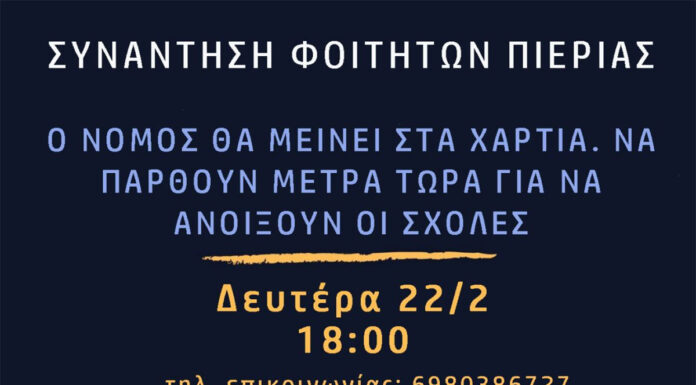 Η Επιτροπή Φοιτητών Πιερίας καλεί σε συνάντηση των φοιτητών στην Κατερίνη τη Δευτέρα 22 Φλεβάρη στις 6 μ.μ. για το συντονισμό των αγωνιστικών πρωτοβουλιών...