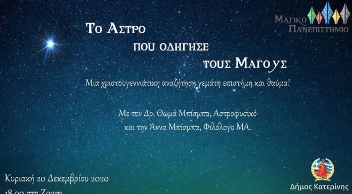 Χριστουγεννιάτικη Διαδικτυακή εκδήλωση από το Ολύμπιο Κέντρο Αστροφυσικής με συνδιοργανωτές τον Δήμο Κατερίνης & τη Δημοτική Κοινωφελή Επιχείρηση Θάσου   «ΤΟ ΑΣΤΡΟ ΠΟΥ ΟΔΗΓΗΣΕ ΤΟΥΣ ΜΑΓΟΥΣ»,...
