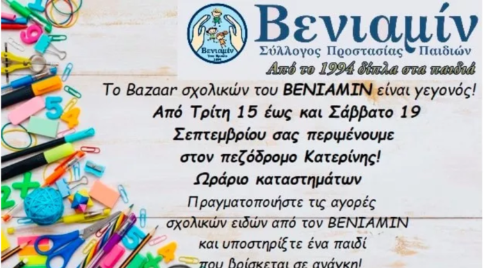 Όλα τα επώνυμα σχολικά σας περιμένουν στο Bazaar του ΒΕΝΙΑΜΙΝ στον πεζόδρομο Κατερίνης. Από σήμερα Τρίτη 15 έως και το Σάββατο 19 Σεπτεμβρίου Επιλέγοντας να πραγματοποιήσεις...