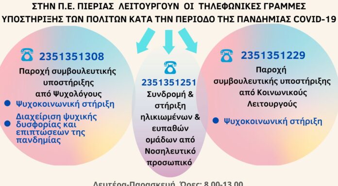 Σοφία Μαυρίδου, Αντιπεριφερειάρχης Πιερίας: «Στη δύσκολη περίοδο της πανδημίας του κορονοϊού, δεν αφήνουμε κανέναν πολίτη μόνο. Η Περιφέρεια Κεντρικής Μακεδονίας και η Περιφερειακή Ενότητα Πιερίας,...