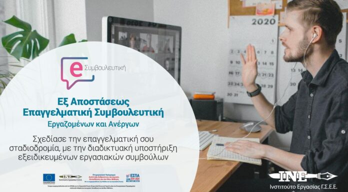 Το Ινστιτούτο Εργασίας/Γ.Σ.Ε.Ε ανακοινώνει την ανάπτυξη και παροχή υπηρεσιών εξ αποστάσεως επαγγελματικής συμβουλευτικής, εργαζομένων και ανέργων. Πρόκειται για υπηρεσίες ατομικής συμβουλευτικής που υποστηρίζονται τεχνικά από...