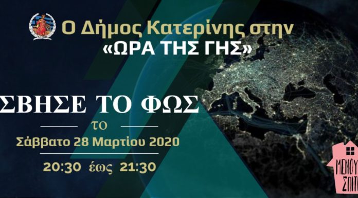 Στην παγκόσμια πρωτοβουλία ευαισθητοποίησης πολιτών, με τίτλο «Η Ώρα της Γης», που αναλαμβάνει και φέτος ο Οργανισμός WWF συμμετέχει ο Δήμος Κατερίνης. Στο πλαίσιο της δράσης αυτής, το Σάββατο 28 Μαρτίου 2020, από τις 20.30...