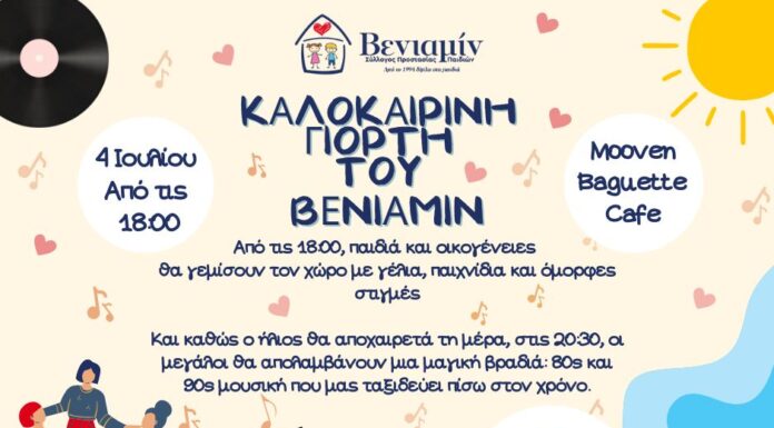 Με ιδιαίτερη χαρά και τιμή, ο Σύλλογος Προστασίας Παιδιών ΒΕΝΙΑΜΙΝ σας προσκαλεί στην Καλοκαιρινή Γιορτή του ΒΕΝΙΑΜΙΝ, η οποία θα πραγματοποιηθεί 4 Ιουλίου στο...
