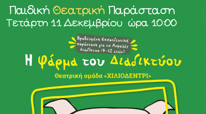 Συνεδριακό Κέντρο Κατερίνης Τετάρτη 11 Δεκεμβρίου & ώρα 10:00 π.μ.   Τη βραβευμένη εκπαιδευτική παιδική θεατρική παράσταση «Η φάρμα του διαδικτύου», μία παράσταση υψηλών απαιτήσεων για παιδιά...