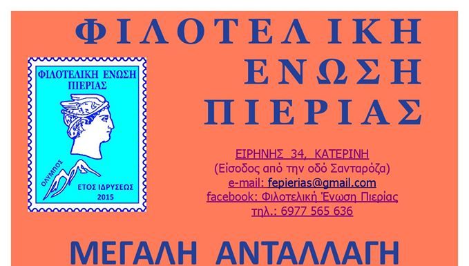 Μεγάλη ανταλλαγή και προσφορά γραμματοσήμων από την Φιλοτελική Ένωση Πιερίας, θα πραγματοποιηθεί την Κυριακή 01/12 και ώρα 11:00 στο Εντευκτήριο της Φ.Ε. Πιερίας. Εξέταση λαχνών:...