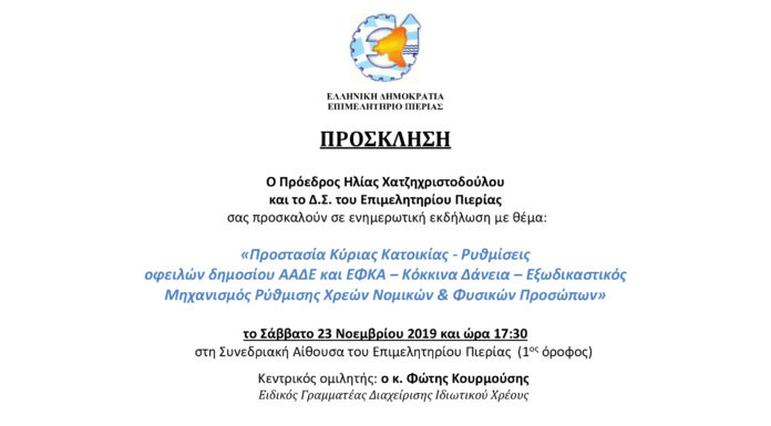 Ενημερωτική εκδήλωση στο Επιμελητήριο Πιερίας με θέμα «Προστασία Κύριας Κατοικίας – Ρυθμίσεις οφειλών δημοσίου ΑΑΔΕ και ΕΦΚΑ – Κόκκινα Δάνεια – Εξωδικαστικός Μηχανισμός Ρύθμισης...