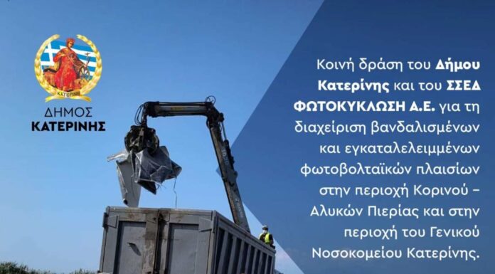 Σε εξέλιξη είναι από τον Δήμο Κατερίνης και τον μοναδικό εγκεκριμένο  φορέα στην Ελλάδα συλλογικού συστήματος εναλλακτικής διαχείρισης φωτοβολταϊκών πλαισίων ΣΣΕΔ  ΦΩΤΟΚΥΚΛΩΣΗ Α.Ε., κοινή δράση...