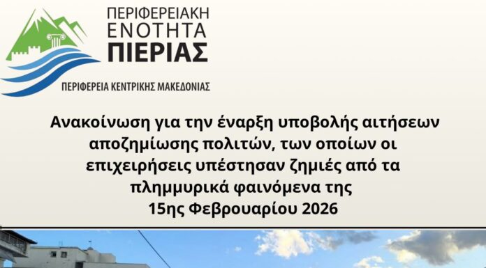 Με εντολή της Αντιπεριφερειάρχη Πιερίας, κ. Σοφίας Μαυρίδου και κατόπιν συντονισμένων ενεργειών, για την επιτάχυνση των διαδικασιών καταγραφής και βεβαίωσης των ζημιών, ΚΑΛΟΥΝΤΑΙ όλες οι...