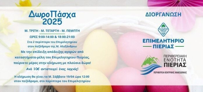 Το Επιμελητήριο Πιερίας και η Περιφερειακή Ενότητα Πιερίας, διοργανώνουν μια ξεχωριστή πασχαλιάτικη δράση με στόχο την ενίσχυση της τοπικής αγοράς και τη στήριξη των...