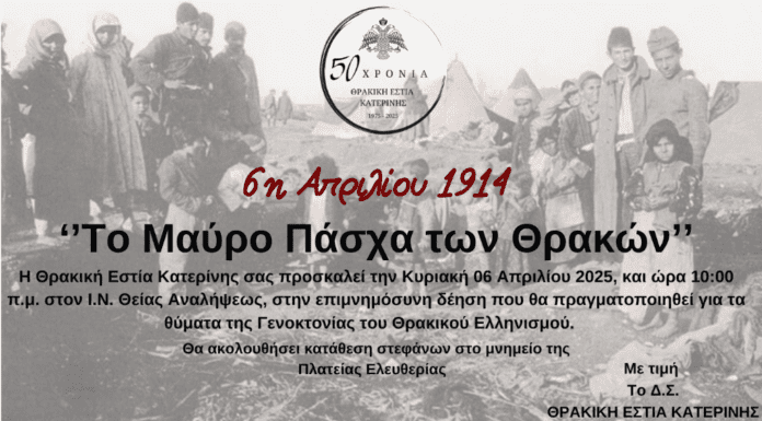 Σας προσκαλούμε να τιμήσετε με την παρουσία σας την εκδήλωση για την ημέρα μνήμης του Θρακικού Ελληνισμού που θα τελεστεί την Κυριακή 6 Απριλίου 2025...