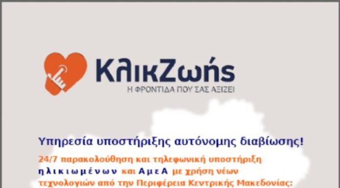 Η Περιφέρεια Κεντρικής Μακεδονίας διοργανώνει την ημερίδα παρουσίασης της καινοτόμου υπηρεσίας τηλεϋποστήριξης της αυτόνομης διαβίωσης ηλικιωμένων και ατόμων με ειδικές ανάγκες «Κλικ Ζωής», την...