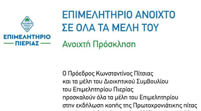 Ο Πρόεδρος Κωνσταντίνος Πίτσιας και τα μέλη του Διοικητικού Συμβουλίου του Επιμελητηρίου Πιερίας, σας προσκαλούν στην ανοιχτή εκδήλωση κοπής της Πρωτοχρονιάτικης πίτας. Η εκδήλωση θα...