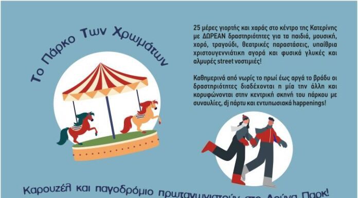 25 μέρες γιορτής και χαράς στο κέντρο της Κατερίνης με ΔΩΡΕΑΝ δραστηριότητες για τα παιδιά, μουσική, χορό, τραγούδι, θεατρικές παραστάσεις, πίστα παρκούρ, υπαίθρια χριστουγεννιάτικη...