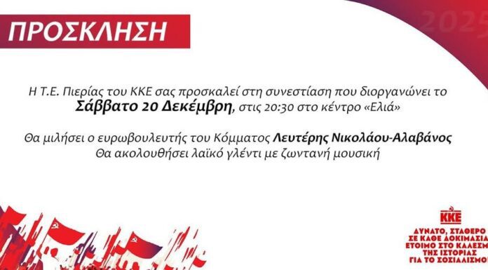 Η Τ.Ε. Πιερίας του ΚΚΕ σας προσκαλεί όλους και όλες στη συνεστίαση που θα πραγματοποιήσει το Σάββατο 20 Δεκέμβρη στο κέντρο "Ελιά" στις 8:30μμ. Θα...