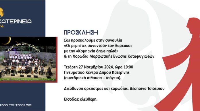 «Κομπανία όπως παλιά» - Χορωδία Μορφωτικής Ένωσης Καταφυγιωτών Πνευματικό Κέντρο Δ. Κατερίνης (συνεδριακή αίθουσα – ισόγειο) Τετάρτη 27 Νοεμβρίου 2024, ώρα: 19:00   Είσοδος: Ελεύθερη