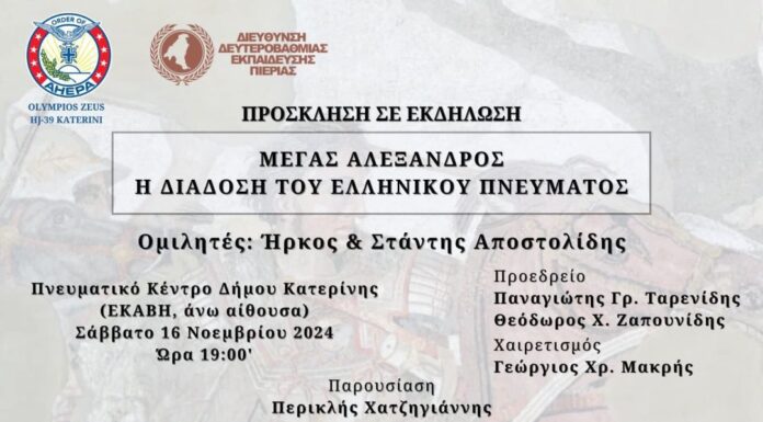Συνεχίζοντας τον κύκλο των εκδηλώσεων ενημερωτικού, επιστημονικού και ιστορικού ενδιαφέροντος, το Τμήμα Κατερίνης «Ολύμπιος Ζευς-39» της οργάνωσης ΑΧΕΠΑ ΕΛΛΑΣ, συνδιοργανώνει με τη Διεύθυνση Δευτεροβάθμιας...