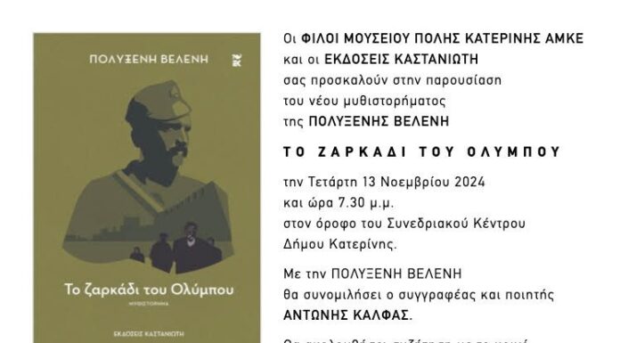 Οι Φίλοι Μουσείου Πόλης Κατερίνης προσκαλούμε το κοινό της πόλης στην παρουσίαση του βιβλίου της Πολυξένης Βελένη  με τίτλο: Το ζαρκάδι του Ολύμπου. Ημέρα:...