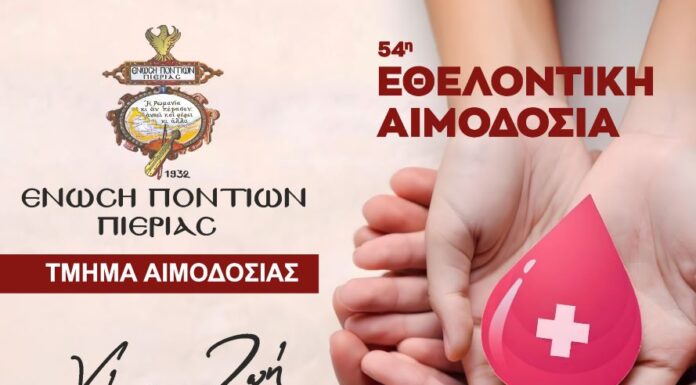 Η ΕΝΩΣΗ ΠΟΝΤΙΩΝ ΠΙΕΡΙΑΣ καλεί τα μέλη και τους φίλους του συλλόγου στην 54η Εθελοντική Αιμοδοσία που θα πραγματοποιηθεί την Κυριακή 13 Οκτωβρίου 2024...