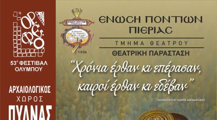 Λόγω κακών καιρικών συνθηκών αναβάλλεται η προγραμματισμένη θεατρική παράσταση της Ένωσης Ποντίων Πιερίας σήμερα 7 Σεπτεμβρίου στην Αρχαία Πύδνα.