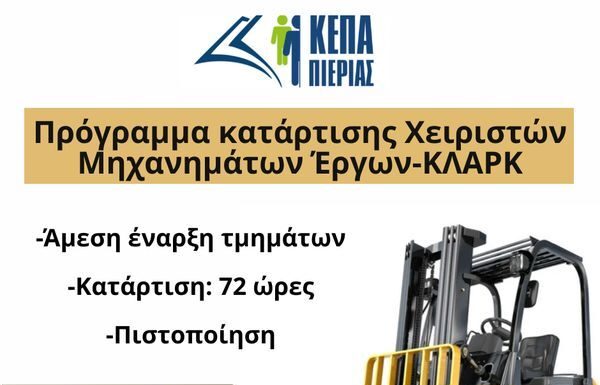 Το ΚΕΠΑ ΠΙΕΡΙΑΣ ΚΔΒΜ πρόκειται να υλοποιήσει πρόγραμμα το οποίο απευθύνεται σε όσους ενδιαφέρονται να εργαστούν ως χειριστές μηχανημάτων έργων συνολικής ισχύος κινητήρων άνω...