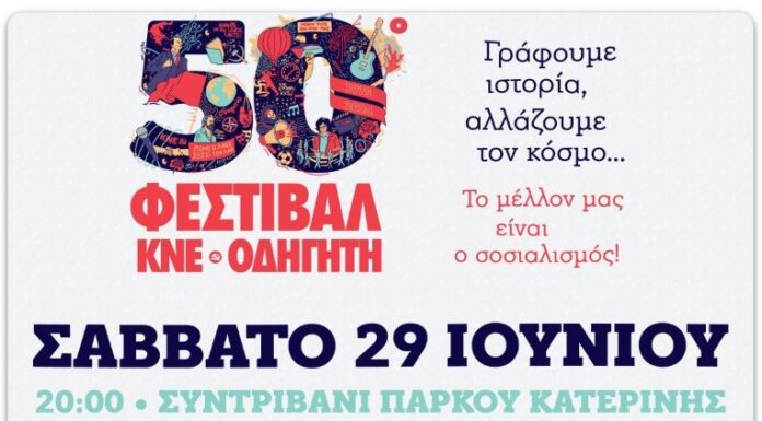 Το 50ο Φεστιβάλ της ΚΝΕ-ΟΔΗΓΗΤΗ στην Κατερίνη θα πραγματοποιηθεί το Σάββατο 29 Ιούνη και ώρα 8:30μμ στο Σιντριβάνι του Πάρκου Κατερίνης. Το σύνθημα του φεστιβάλ...
