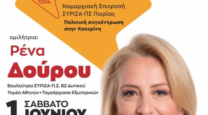 Σήμερα Σάββατο 1η Ιουνίου και ώρα 12:00μ.μ. η Ρένα Δούρου, θα βρίσκεται στο εκλογικό κέντρο του ΣΥΡΙΖΑ στον κεντρικό πεζόδρομο και στις 20:00μ.μ. θα...