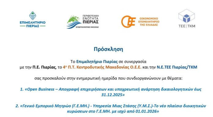 Το Επιμελητήριο Πιερίας σε συνεργασία με την Π.Ε. Πιερίας, το 4ο Π.Τ. Κεντροδυτικής Μακεδονίας Ο.Ε.Ε. και την Ν.Ε.ΤΕΕ Πιερίας/ΤΚΜ συνδιοργανώνουν ενημερωτική ημερίδα με θέματα:...