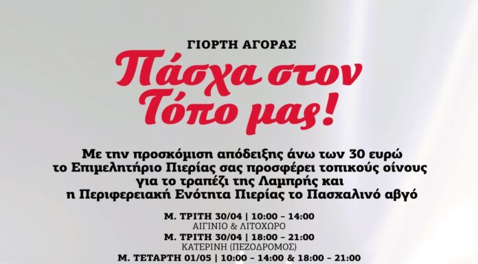 Η Περιφερειακή Ενότητα Πιερίας αποδεικνύει εμπράκτως για ακόμη μία χρονιά τη στήριξή της στην τοπική αγορά συνεχίζοντας τις πασχαλινές δράσεις “Πάσχα στον Τόπο μας”...