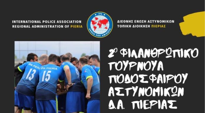 Με γνώμονα την αλληλεγγύη και την στήριξη των συνανθρώπων μας η Τοπική Διοίκηση Πιερίας/Διεθνής Ένωση Αστυνομικών διοργανώνει το 2ο Φιλανθρωπικό Τουρνουά Ποδοσφαίρου Αστυνομικών Δ.Α....